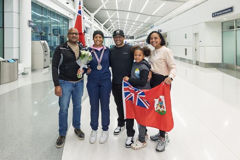 A Government spokesperson said, “Wednesday evening, April 23, members of Bermuda’s Carifta Track & Field team returned home to a proud and heartfelt welcome at LF Wade International Airport. The athletes, fresh from their performances at the Carifta Games, were greeted by family, friends, and the Minister of Tourism & Transport, Culture & Sport, the Hon. Owen Darrell, JP, MP, who was on hand to personally welcome them and offer his congratulations.”