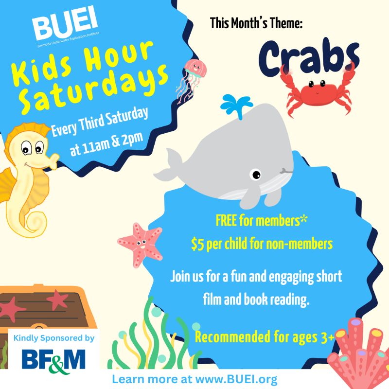 A spokesperson said, “The Bermuda Underwater Exploration Institute [BUEI] invites you to join us for Kids Hour this Saturday, May 17th at 11am and 2pm where we will crawl through the crafty world of crabs.