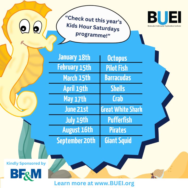 “Space is limited and advanced registration is encouraged by emailing giftshop@buei.bm or calling 294-0204. Visit BUEI.org/kidshour to learn more and be sure to mark your calendar for June 21st when Kids Hour Saturday will poke and prod our way through the pointy world of pufferfish!”