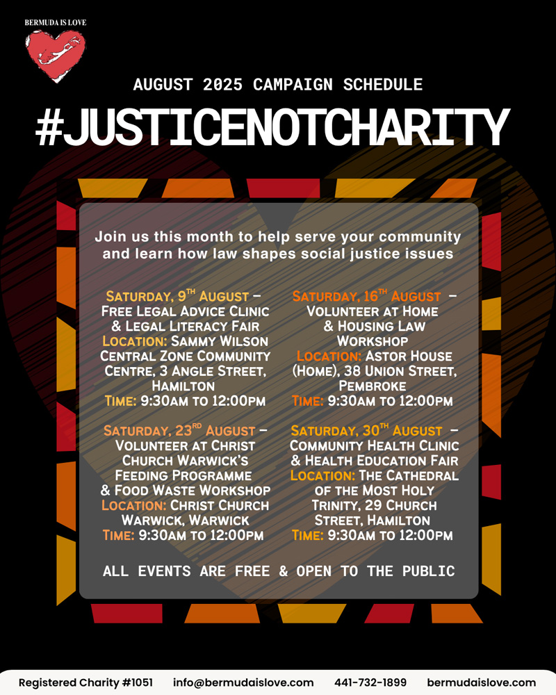 This August, Bermuda Is Love is launching the #JusticeNotCharity Campaign with a series of “justice-themed events that unite direct service and action with legal education and grassroots advocacy.”