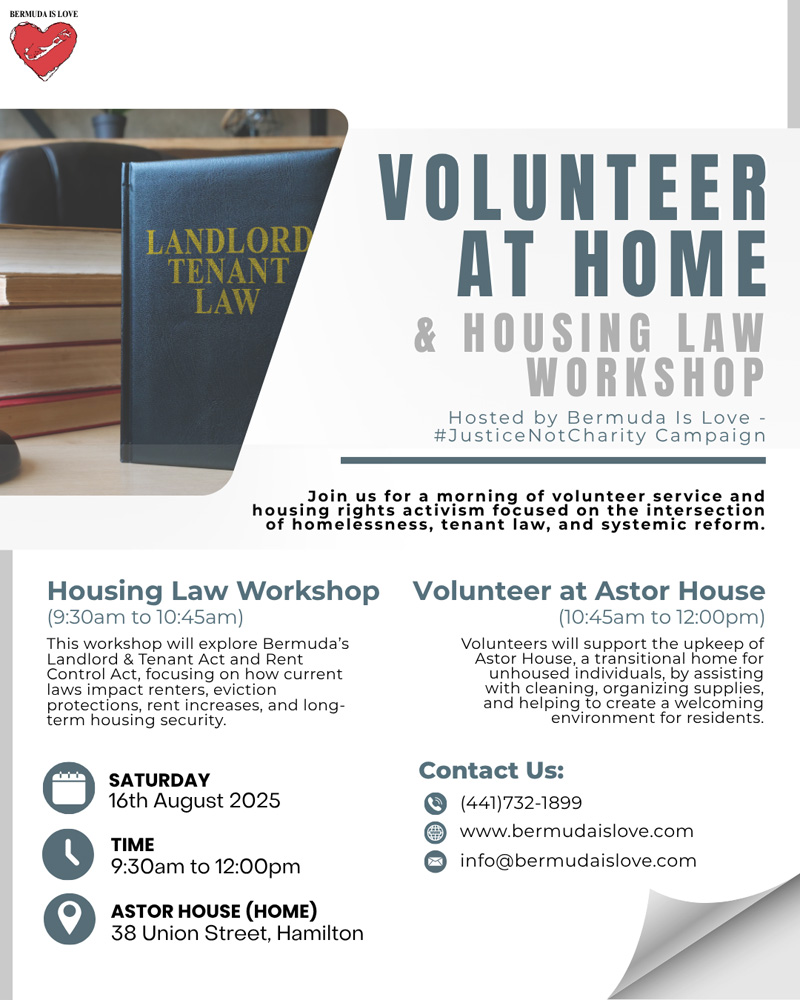 “But awareness alone is not enough. This campaign is also about doing the work. Bermuda Is Love views mutual aid as a dignified, community-led alternative to charity, where neighbours support one another through volunteering, resource-sharing, and mutual care. This month’s legal and health clinics, and food and housing volunteer efforts are paired with systemic education, helping people meet immediate needs while exposing and challenging the structures that create them.