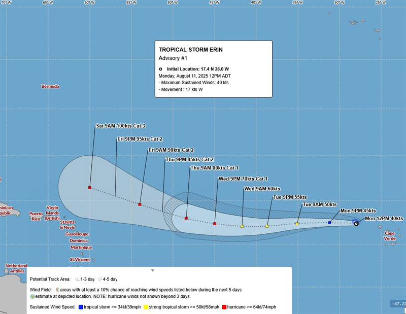 Tropical Storm Erin is “not a threat to Bermuda at this time”, the Bermuda Weather Service said, with its closest point of approach to Bermuda within 72 hours forecast to be 1198 nm to the SE at 12.00pm on Thursday [August 14], with the BWS noting that “this system may move closer to Bermuda after this time period depending upon its track.”