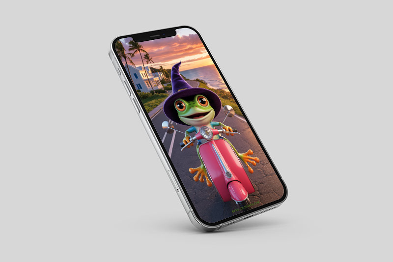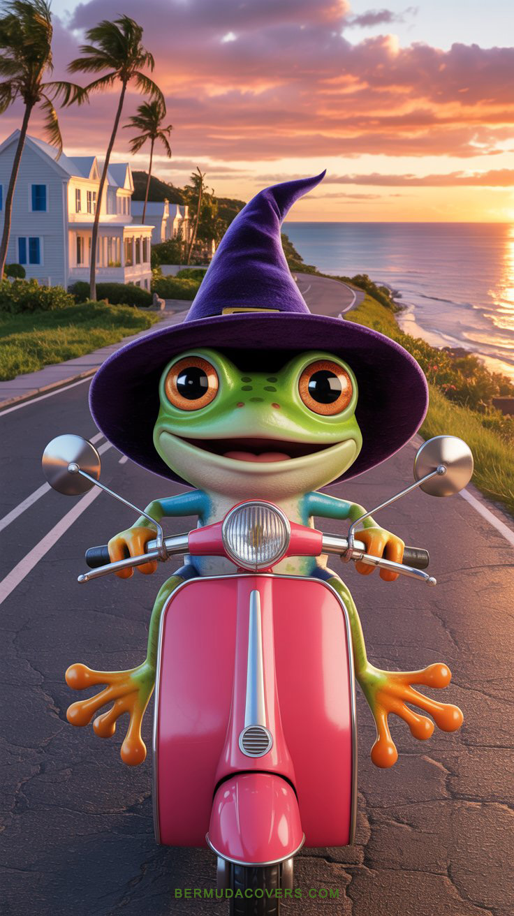 The latest design in Bernews’ weekly Wallpaper Wednesday series features a playful treefrog embracing the Halloween spirit, cruising on a pink scooter beneath a glowing sunset sky.