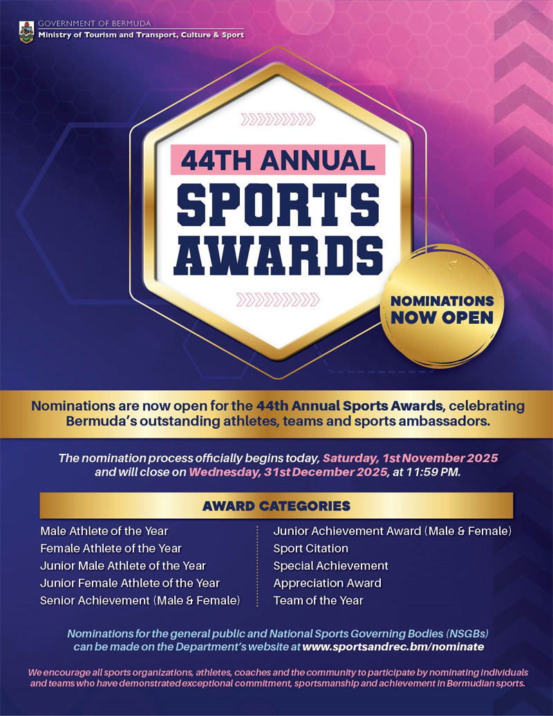The Department of Youth, Sport & Recreation has opened nominations for the 44th Annual Sports Awards, which celebrate Bermuda’s top athletes, teams, and sports ambassadors.