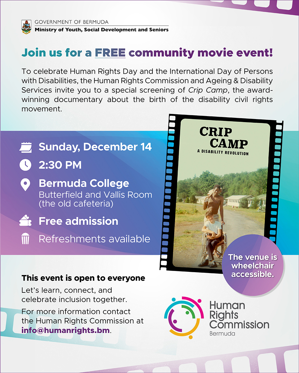 A Government spokesperson said, “The Human Rights Commission [HRC] and Ageing and Disability Services [ADS] invite the public to a free community screening of the award-winning documentary Crip Camp: A Disability Revolution on Sunday, 14 December 2025, at 2:30 pm in the Butterfield and Vallis Room at Bermuda College.”
