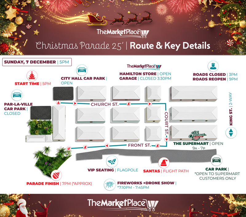 “The parade route starts: Par-la-Ville parking lot → Church Street → Court Street → Front Street → finish Birdcage. Further public information, including road closures, parking, and safety advisories, is available on our website at www.marketplace.bm/christmas-parade-2025