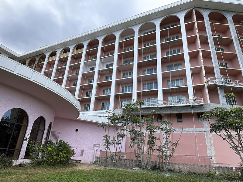 A spokesperson added, “At the main hotel, the exterior envelope required extensive repairs including removing and replacing a significant portion of the concrete and stucco. All steel superstructure is intact, and all of the balcony railings have been demolished and will be replaced. Finishes are being applied to the East and North wings. New roofing is complete on the North Wing and work has started on the West Wing and the ballroom roofs.