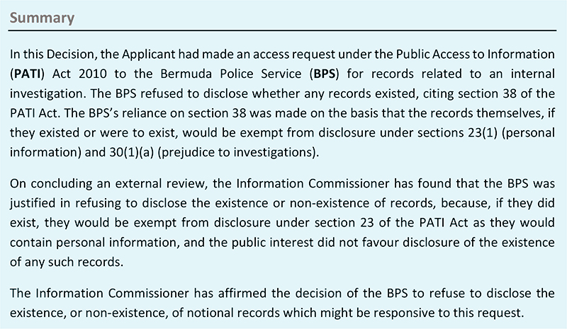 “The Information Commissioner affirmed the BPS’s decision to refuse to disclose whether records existed, because, if they did exist, they would be exempt from disclosure under section 23 of the PATI Act as they would contain personal information, and the public interest did not favour disclosure of the existence of any such records.