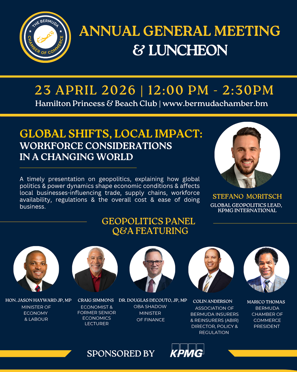 The Bermuda Chamber of Commerce will host its 2026 Annual General Meeting [AGM] & Luncheon, sponsored by KPMG in Bermuda, on Thursday, 23 April 2026 from 12:00 p.m. to 2:30 p.m. at the Hamilton Princess & Beach Club.