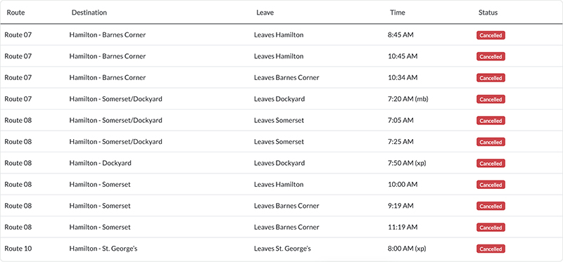 The Ministry released the list of bus cancellations for this morning [April 7] with the list indicating that there are eleven bus runs cancelled so far today.