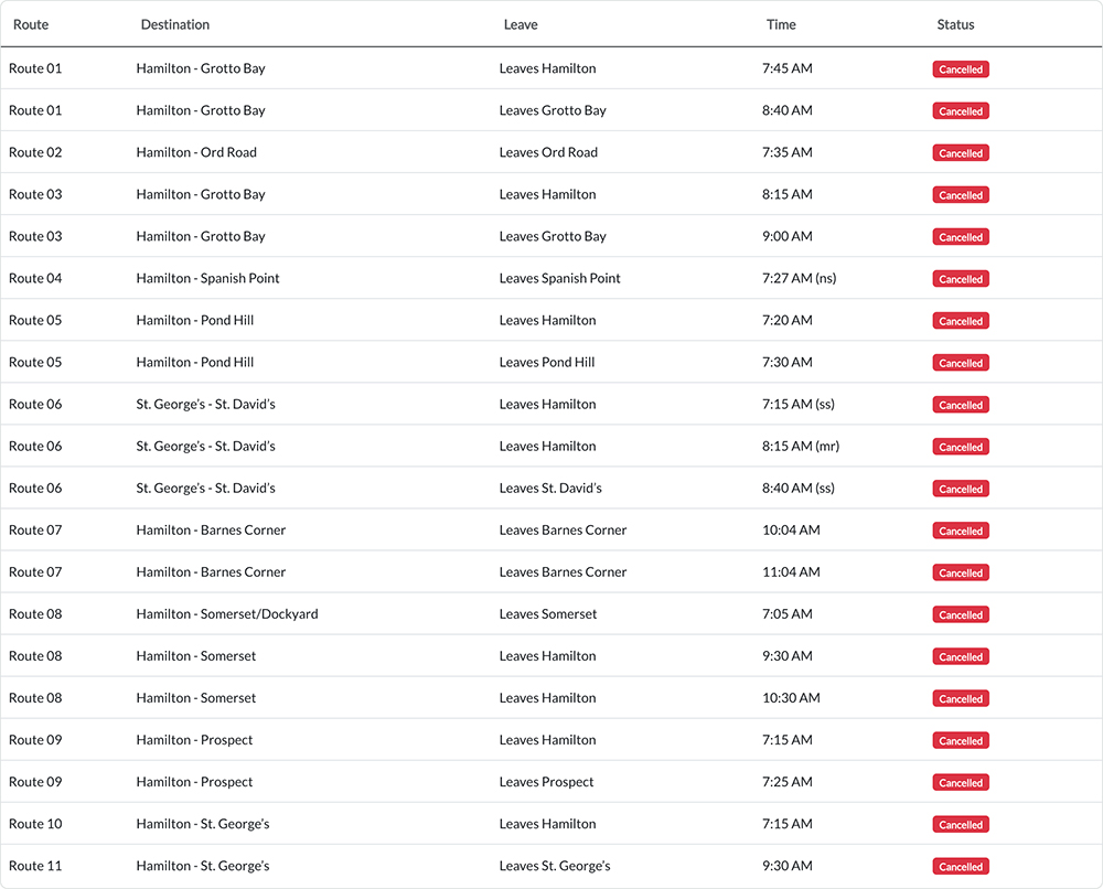 The Ministry released the list of bus cancellations for this morning [April 23] with the list indicating that there are twenty bus runs cancelled so far today.